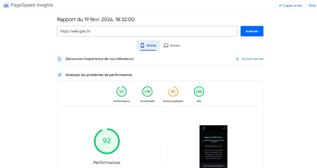 PageSpeed Insights est un service web gratuit développé par Google qui évalue les performances d’une page sur mobile et desktop. L’outil génère un score compris entre 0 et 100, accompagné de recommandations personnalisées pour améliorer la vitesse de chargement.